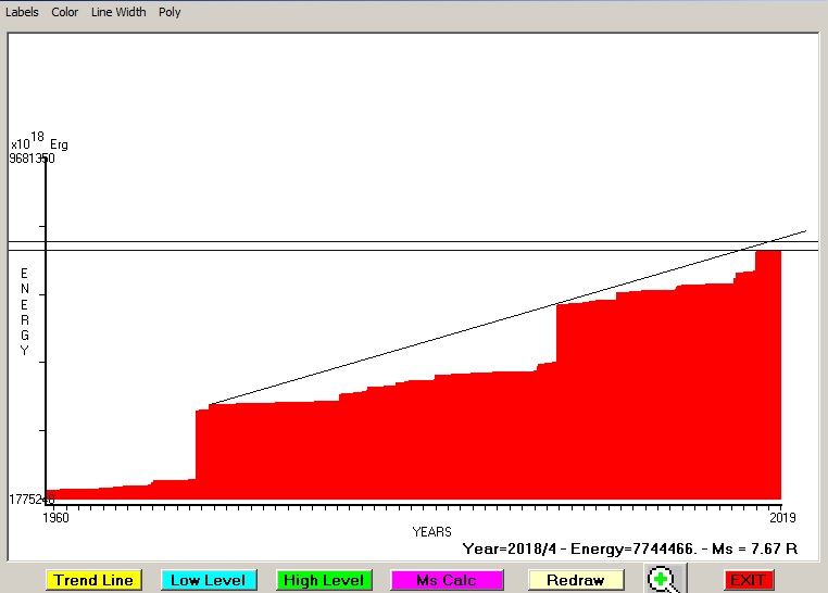 Fig. 4. Expected EQ magnitude due to application of the LSEFM (Lithospheric Seismic Energy Flow Model) on past seismic history of the regional seismogenic area.