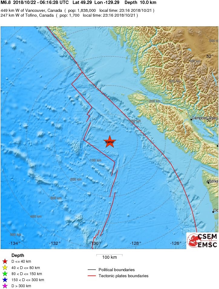 M 6.8 - VANCOUVER ISLAND, CANADA REGION - 2018-10-22 06:16:28 UTC