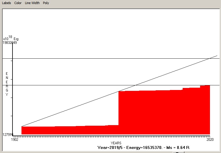 Fig. 5. Expected EQ magnitude due to application of the LSEFM (Lithospheric Seismic Energy Flow Model) on past (since 1902) seismic history of the regional seismogenic area.