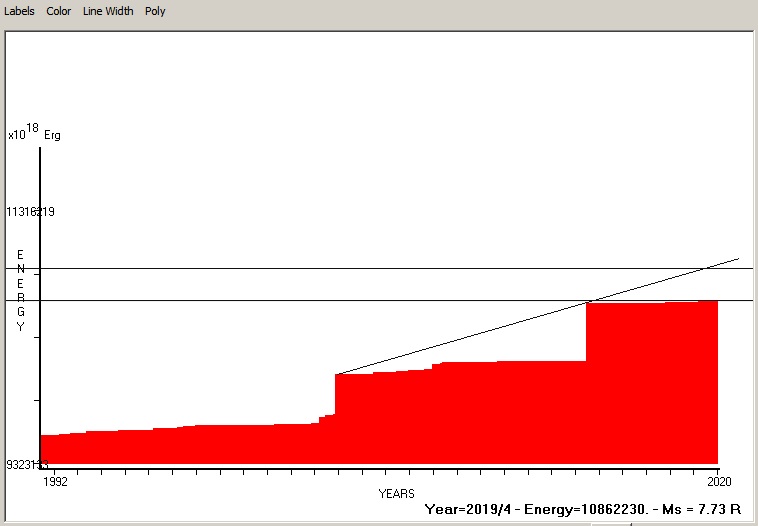 Fig. 4. Expected EQ magnitude due to application of the LSEFM (Lithospheric Seismic Energy Flow Model) on past (since 1992) seismic history of the regional seismogenic area.