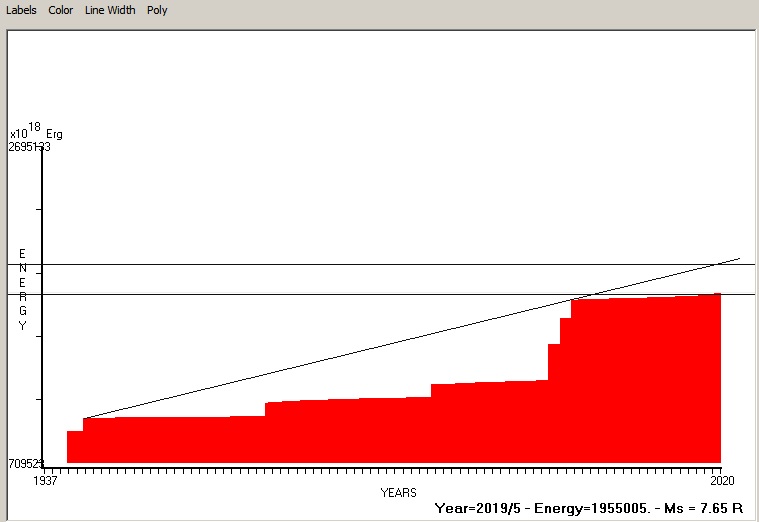 Fig. 5. Expected EQ magnitude due to application of the LSEFM (Lithospheric Seismic Energy Flow Model) on past (since 1937) seismic history of the regional seismogenic area.