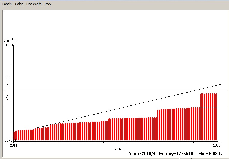 Fig. 4. Expected EQ magnitude due to application of the LSEFM (Lithospheric Seismic Energy Flow Model) on past (since 2011) seismic history of the regional seismogenic area.