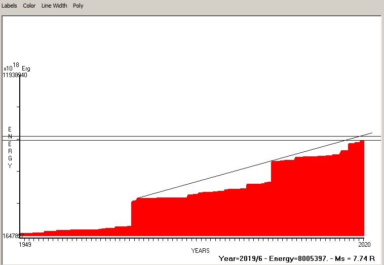 Fig. 5. Expected EQ magnitude due to application of the LSEFM (Lithospheric Seismic Energy Flow Model) on past (since 1948) seismic history of the regional seismogenic area.