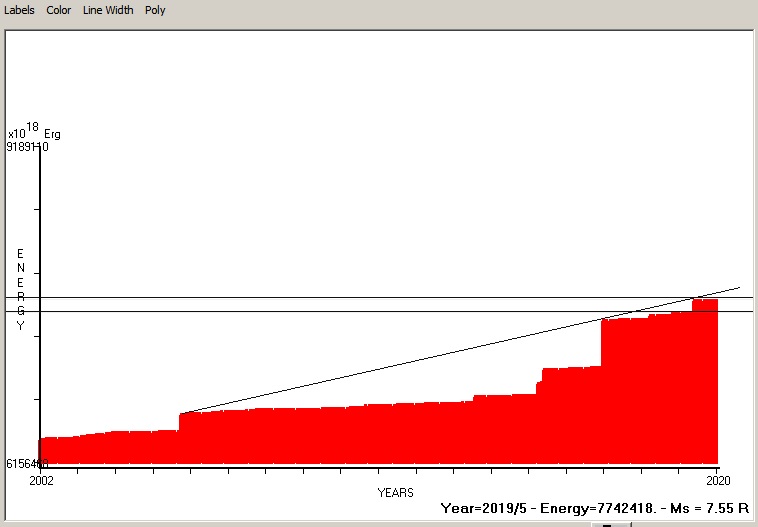 Fig. 4. Expected EQ magnitude due to application of the LSEFM (Lithospheric Seismic Energy Flow Model) on past (since 2002) seismic history of the regional seismogenic area.