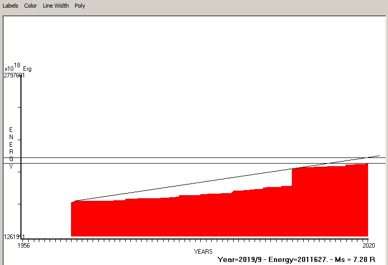 Fig. 4. Expected EQ magnitude due to application of the LSEFM (Lithospheric Seismic Energy Flow Model) on past (since 1956) seismic history of the regional seismogenic area.