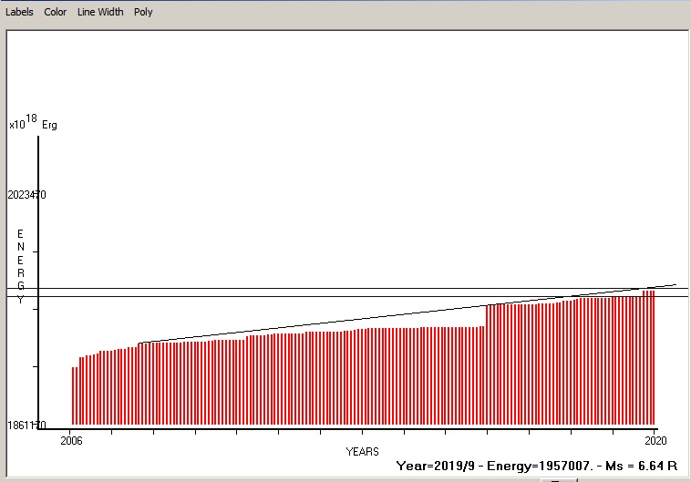 Fig. 5. Expected EQ magnitude due to application of the LSEFM (Lithospheric Seismic Energy Flow Model) on past (since 2005) seismic history of the regional seismogenic area.