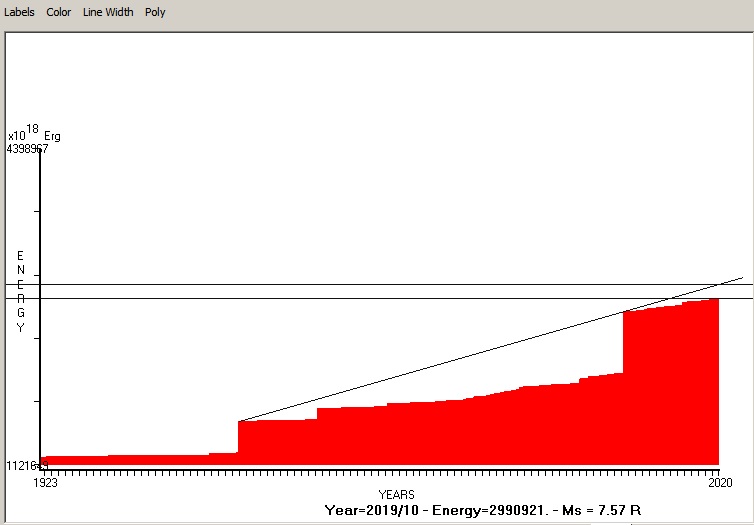 Fig. 4. Expected EQ magnitude due to application of the LSEFM (Lithospheric Seismic Energy Flow Model) on past (since 1923) seismic history of the regional seismogenic area.