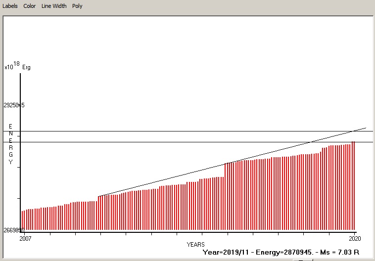 Fig. 5. Expected EQ magnitude due to application of the LSEFM (Lithospheric Seismic Energy Flow Model) on past (since 2007) seismic history of the regional seismogenic area.
