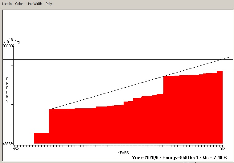 Fig. 4. Expected EQ magnitude due to application of the LSEFM (Lithospheric Seismic Energy Flow Model) on past (since 1962) seismic history of the regional seismogenic area.