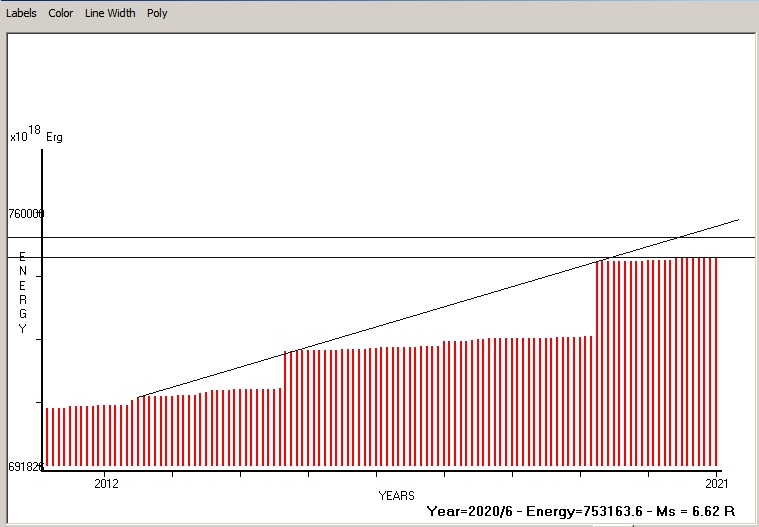 Fig. 5. Expected EQ magnitude due to application of the LSEFM (Lithospheric Seismic Energy Flow Model) on past (since 2011) seismic history of the regional seismogenic area.
