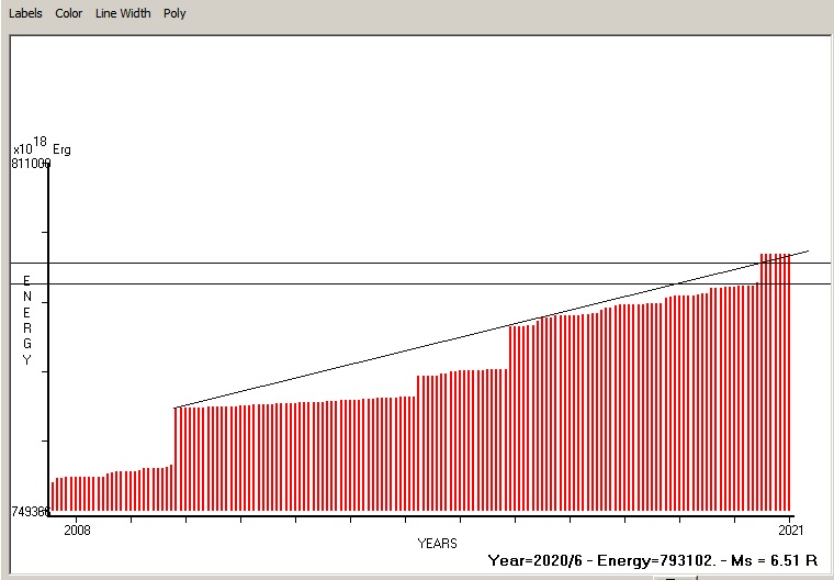 Fig. 5. Expected EQ magnitude due to application of the LSEFM (Lithospheric Seismic Energy Flow Model) on past (since 2008) seismic history of the regional seismogenic area.