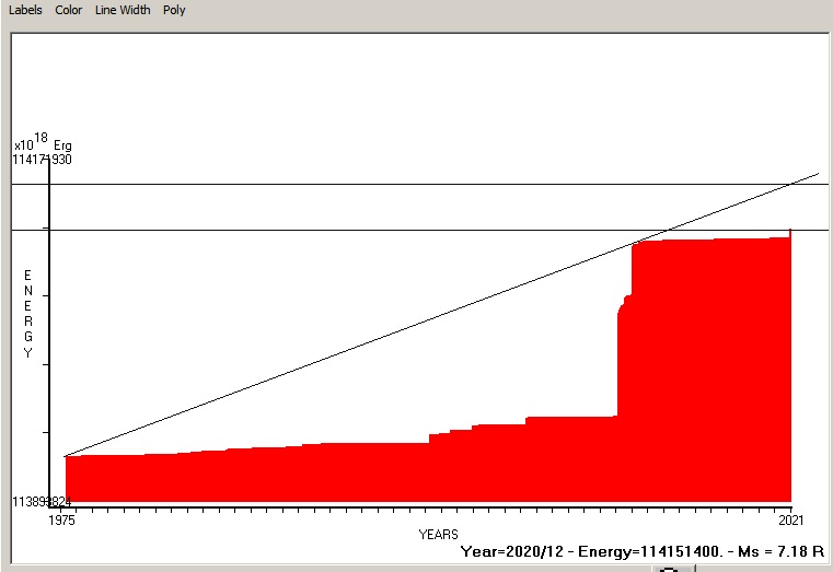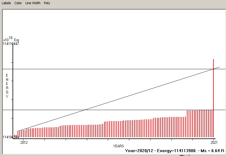 Fig. 4. Expected EQ magnitude due to application of the LSEFM (Lithospheric Seismic Energy Flow Model) on past (since 1975) seismic history of the regional seismogenic area.