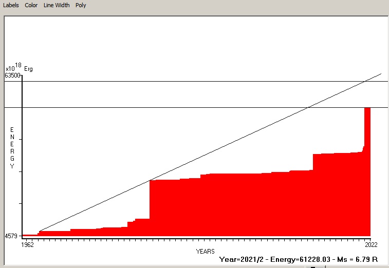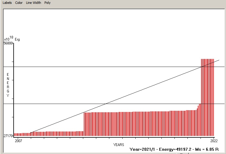 Fig. 4. Expected EQ magnitude due to application of the LSEFM (Lithospheric Seismic Energy Flow Model) on past (since 1962) seismic history of the regional seismogenic area.