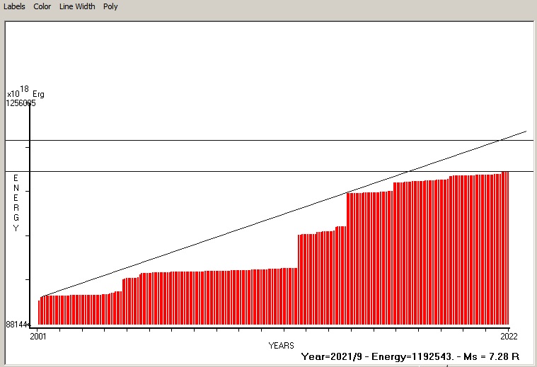 Fig. 6. Expected EQ magnitude due to application of the LSEFM (Lithospheric Seismic Energy Flow Model) on past (since 2001) seismic history of the regional seismogenic area.