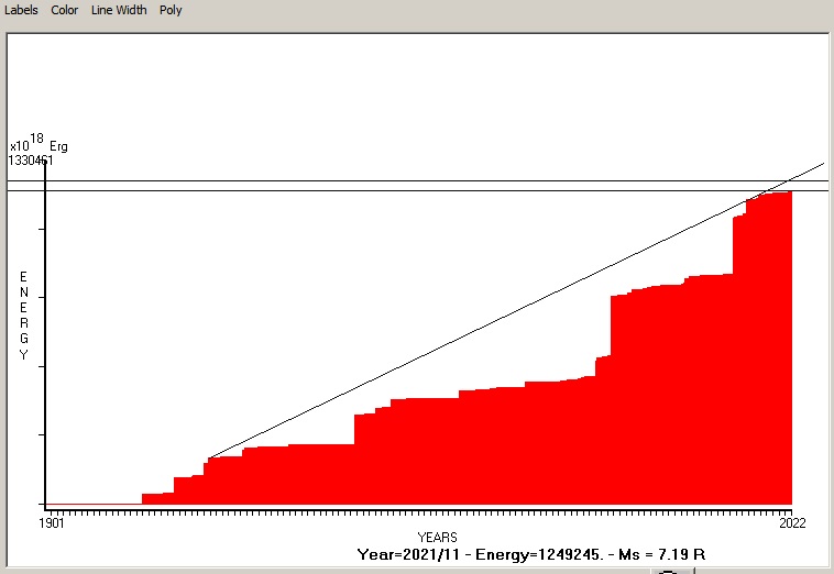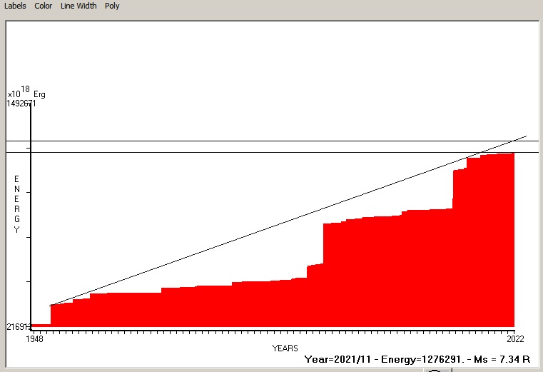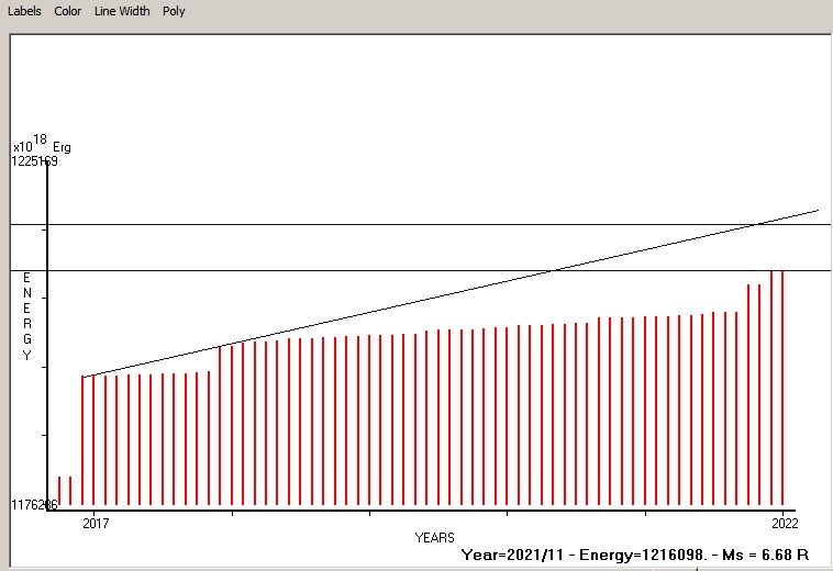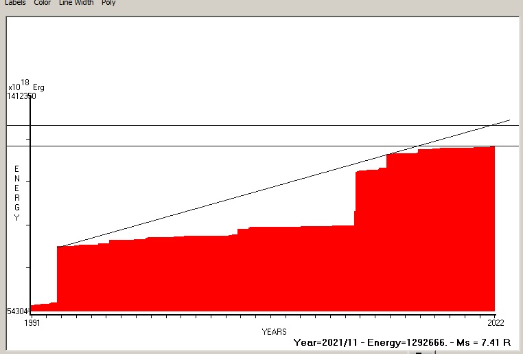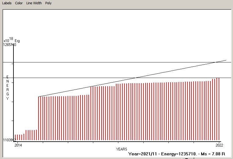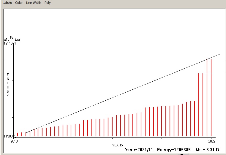 Fig. 9. Expected EQ magnitude due to application of the LSEFM (Lithospheric Seismic Energy Flow Model) on past (since 2018) seismic history of the regional seismogenic area. Contact us at : gthanding@gmail.com