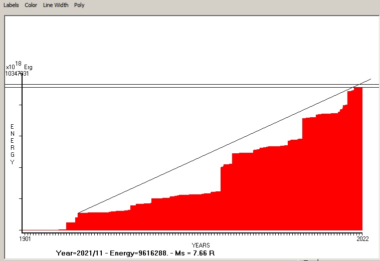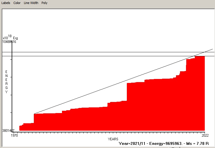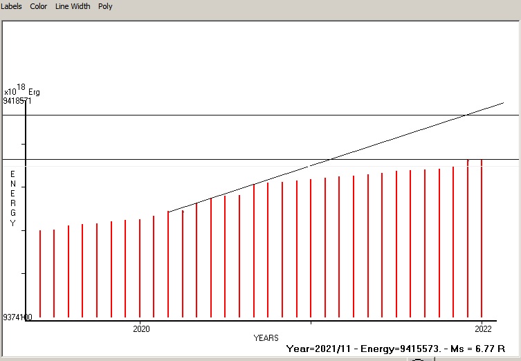 Fig. 7. Expected EQ magnitude due to application of the LSEFM (Lithospheric Seismic Energy Flow Model) on past (since 2017) seismic history of the regional seismogenic area.