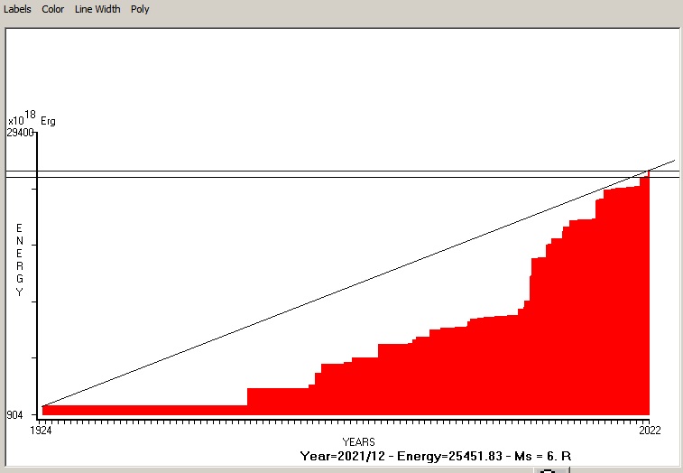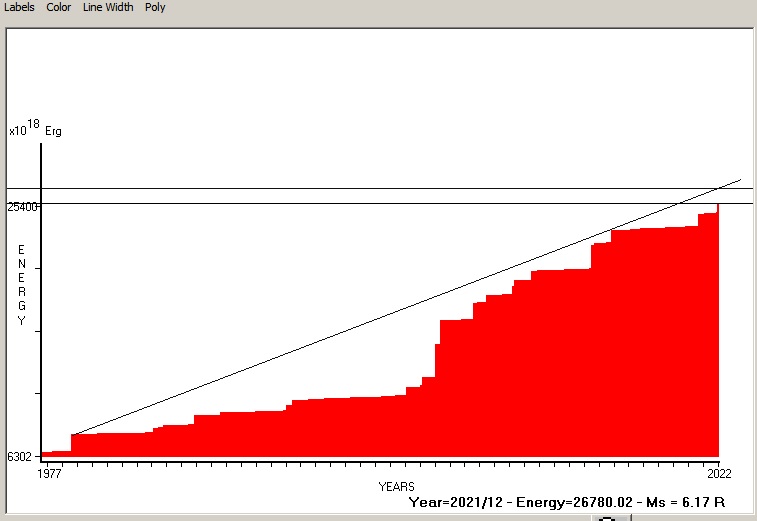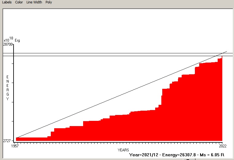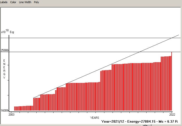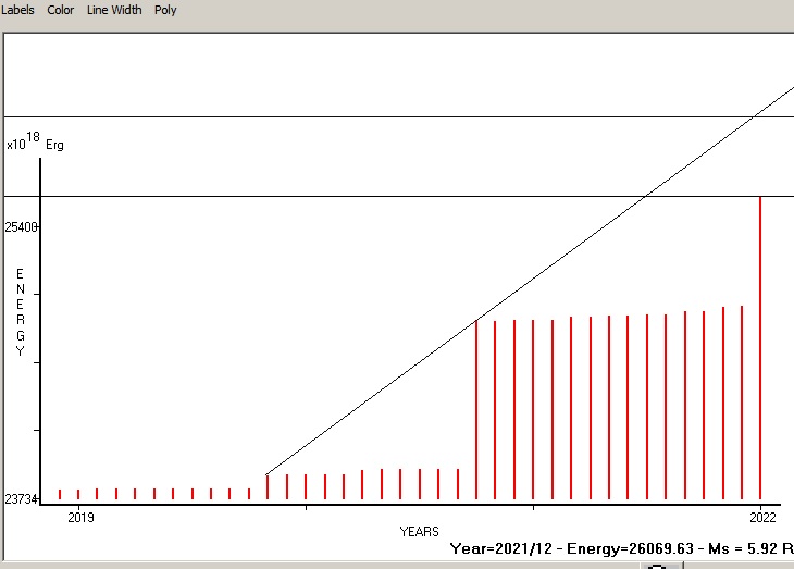 Fig. 9. Expected EQ magnitude due to application of the LSEFM (Lithospheric Seismic Energy Flow Model) on past (since 2019) seismic history of the regional seismogenic area. Contact us at : gthanding@gmail.com
