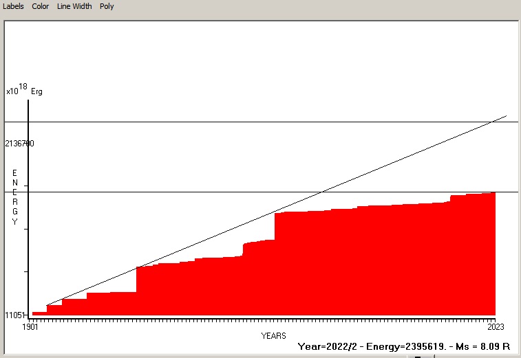 Fig. 9. Expected EQ magnitude due to application of the LSEFM (Lithospheric Seismic Energy Flow Model) on past (since 2016) seismic history of the regional seismogenic area. Contact us at : gthanding@gmail.com