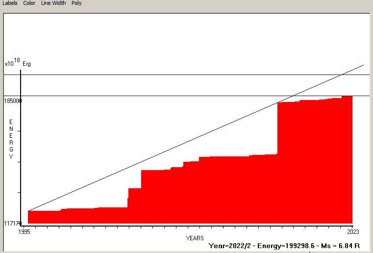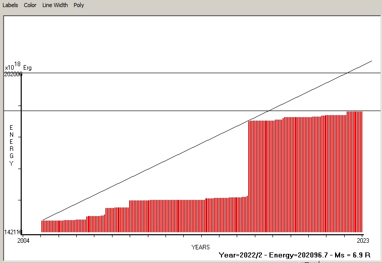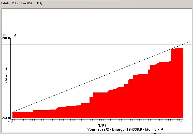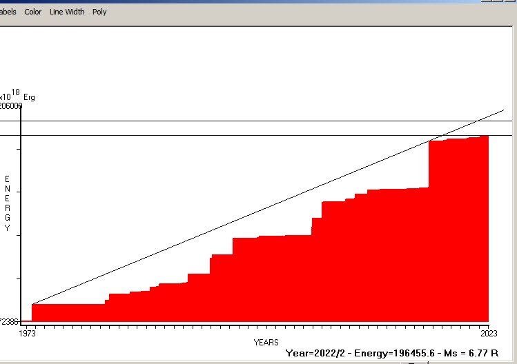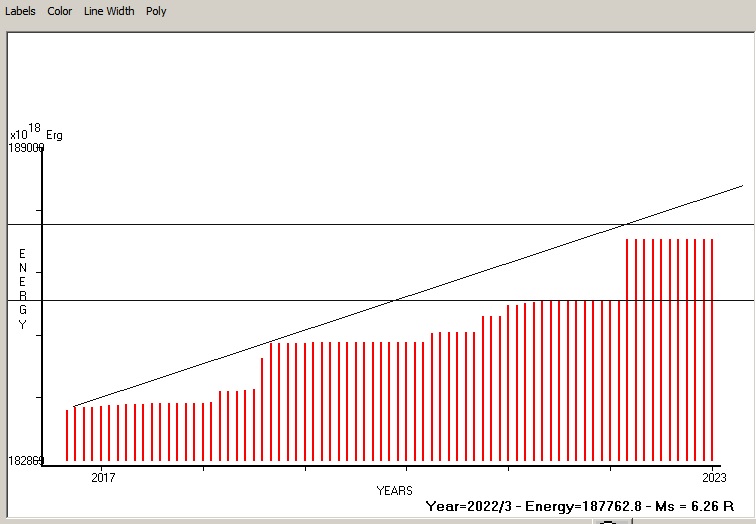 Fig. 8. Expected EQ magnitude due to application of the LSEFM (Lithospheric Seismic Energy Flow Model) on past (since 2016-7) seismic history of the regional seismogenic area. Contact us at : gthanding@gmail.com