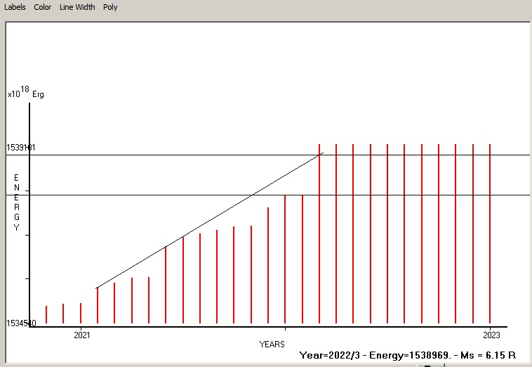 Fig. 9. Expected EQ magnitude due to application of the LSEFM (Lithospheric Seismic Energy Flow Model) on past (since 2020-10) seismic history of the regional seismogenic area. Contact us at : gthanding@gmail.com