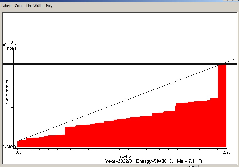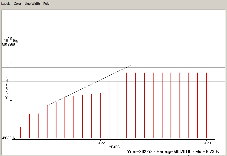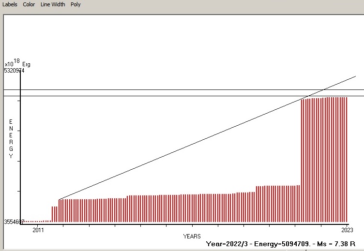 Fig. 6. Expected EQ magnitude due to application of the LSEFM (Lithospheric Seismic Energy Flow Model) on past (since 2021-2) seismic history of the regional seismogenic area. Contact us at : gthanding@gmail.com