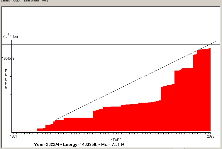 Fig. 8. Expected EQ magnitude due t0 application of the LSEFM (Lithospheric Seismic Energy Flow Model) on past (since 2021) seismic history of the regional seismogenic area. Contact us at : gthanding@gmail.com