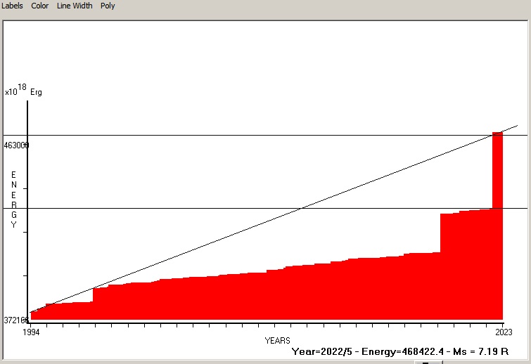 Fig. 4. Expected EQ magnitude due to application of the LSEFM (Lithospheric Seismic Energy Flow Model) on past (since 1994) seismic history of the regional seismogenic area. Contact us at : gthanding@gmail.com