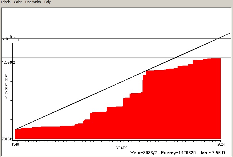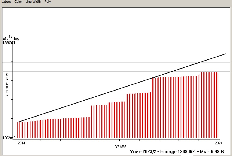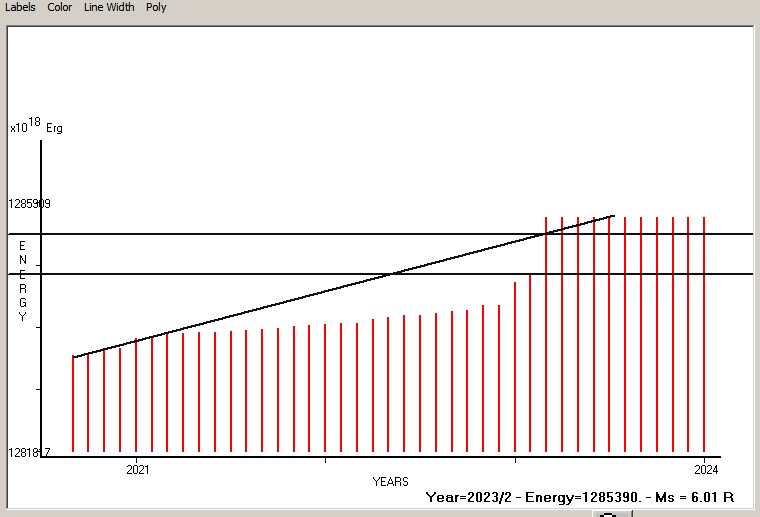 Fig. 9. Expected EQ magnitude due to application of the LSEFM (Lithospheric Seismic Energy Flow Model) on past (since 2020) seismic history of the regional seismogenic area.
