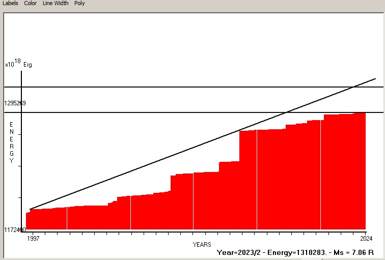 Fig. 7. Expected EQ magnitude due to application of the LSEFM (Lithospheric Seismic Energy Flow Model) on past (since 1997) seismic history of the regional seismogenic area.