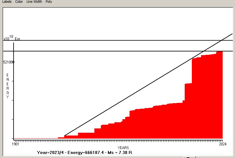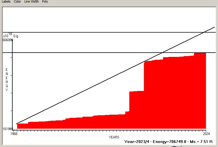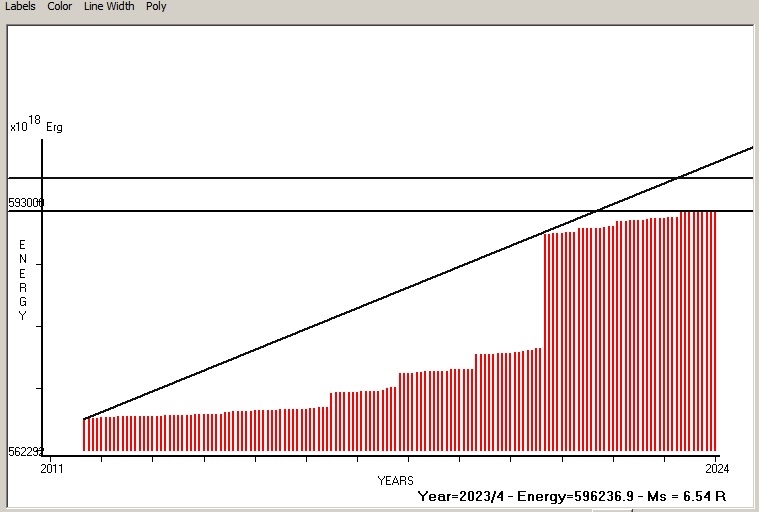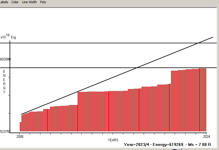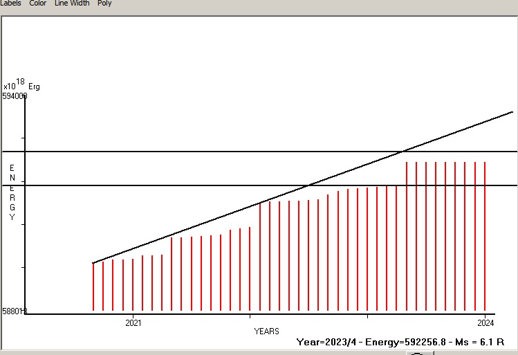 Fig.9. Expected EQ magnitude due to application of the LSEFM (Lithospheric Seismic Energy Flow Model) on past (since 2020) seismic history of the regional seismogenic area Contact us at : gthanding@gmail.com
