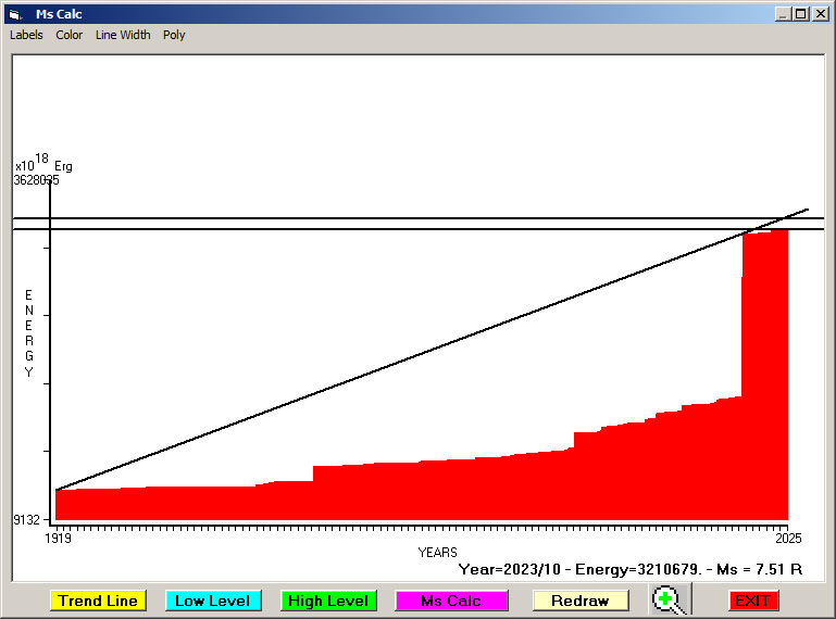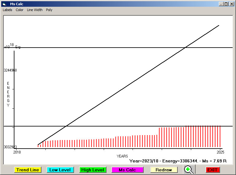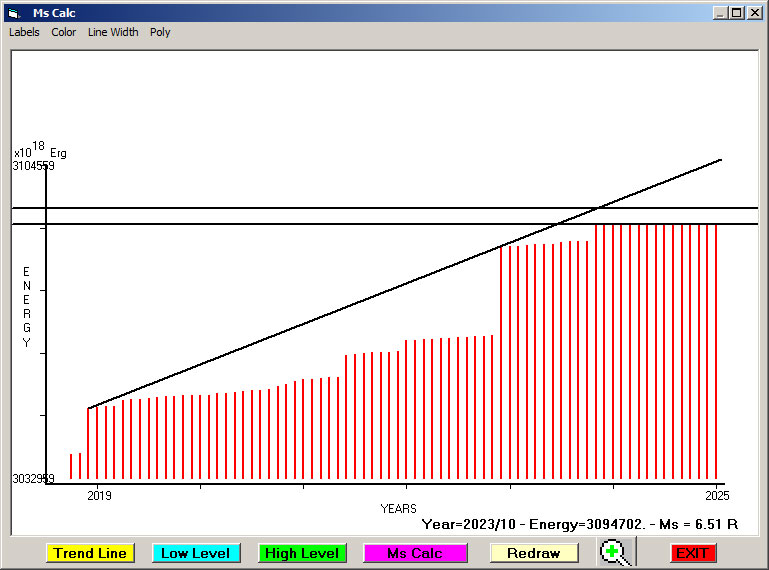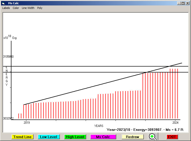 Fig. 8. Expected EQ magnitude due to application of the LSEFM (Lithospheric Seismic Energy Flow Model) on past (since 2019) seismic history of the regional seismogenic area. Contact us at : gthanding@gmail.com