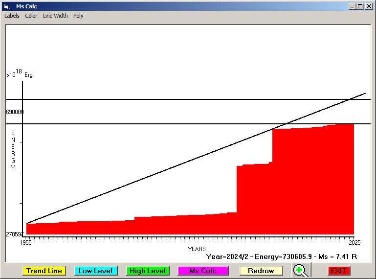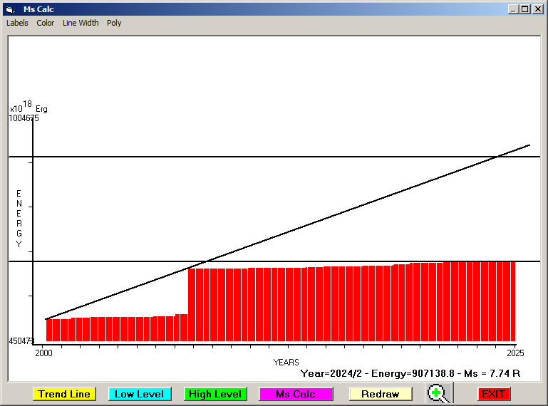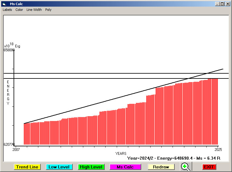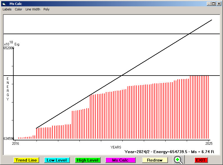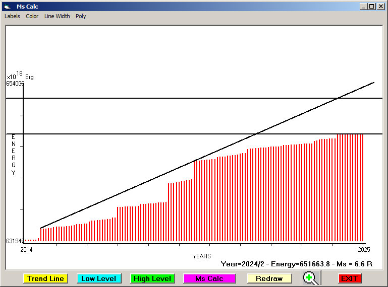 Fig. 14. Expected EQ magnitude due to application of the LSEFM (Lithospheric Seismic Energy Flow Model) on past (since 2023) seismic history of the regional seismogenic area.