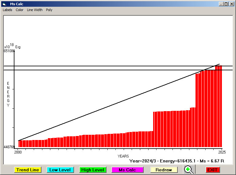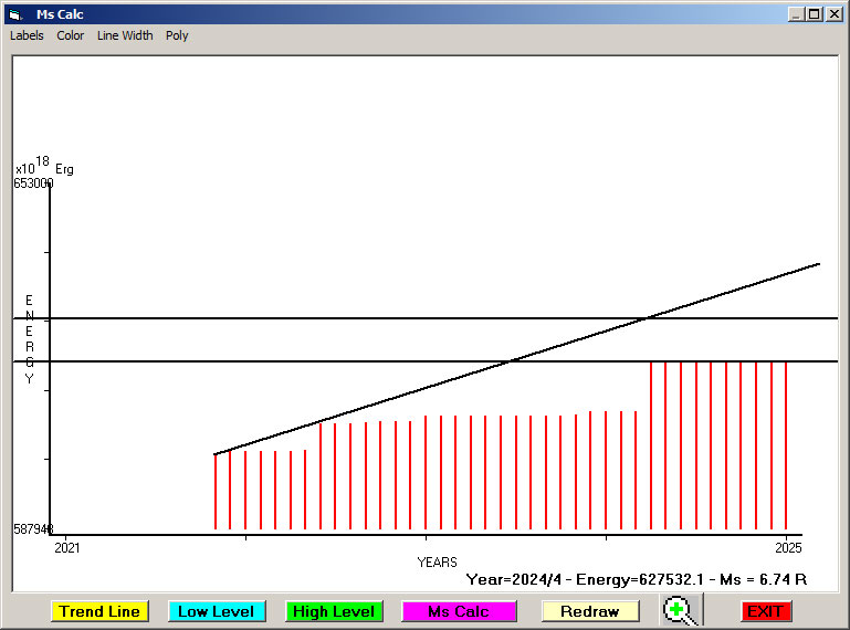 Fig. 6. Expected EQ magnitude due to application of the LSEFM (Lithospheric Seismic Energy Flow Model) on past (since 2021) seismic history of the regional seismogenic area.