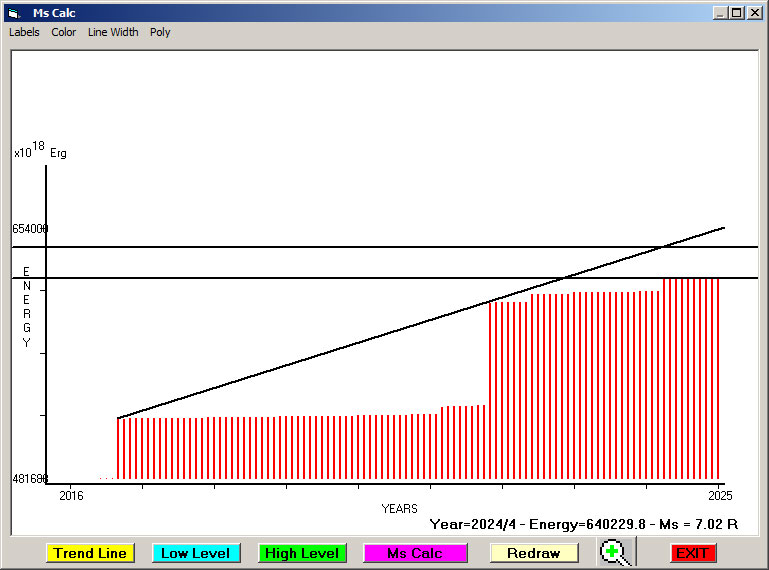 Fig. 5. Expected EQ magnitude due to application of the LSEFM (Lithospheric Seismic Energy Flow Model) on past (since 2016) seismic history of the regional seismogenic area.