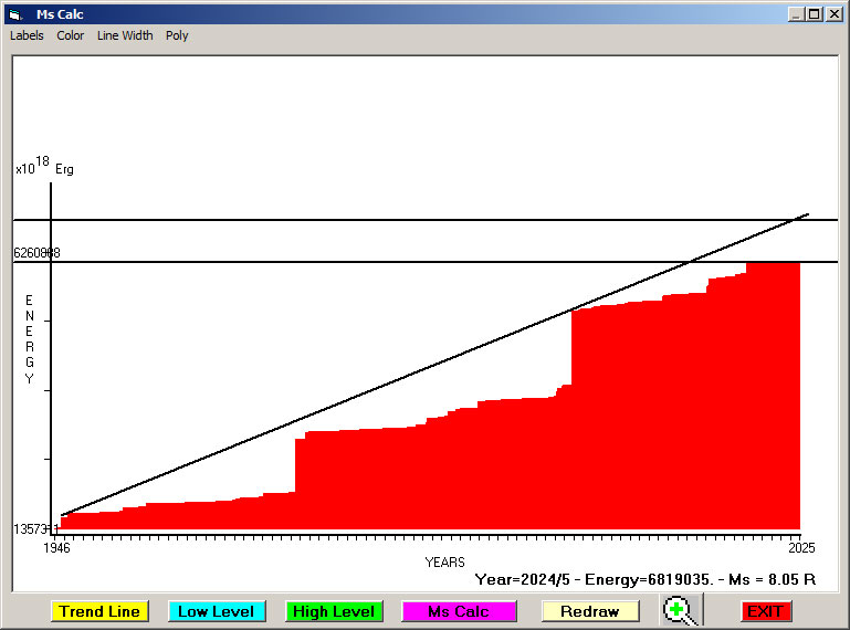 Fig. 8. Expected EQ magnitude due to application of the LSEFM (Lithospheric Seismic Energy Flow Model) on past (since 1946) seismic history of the regional seismogenic area.