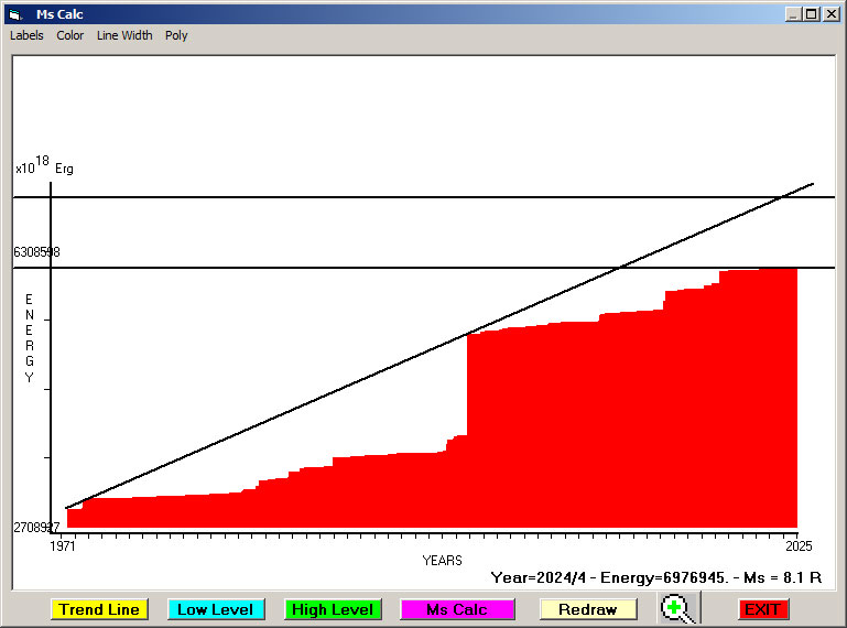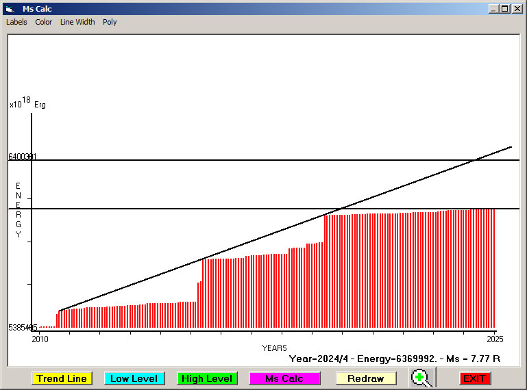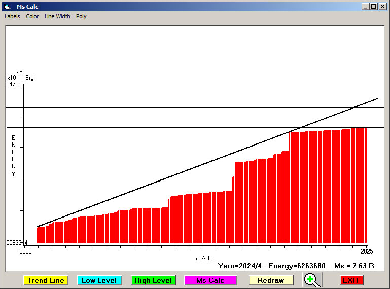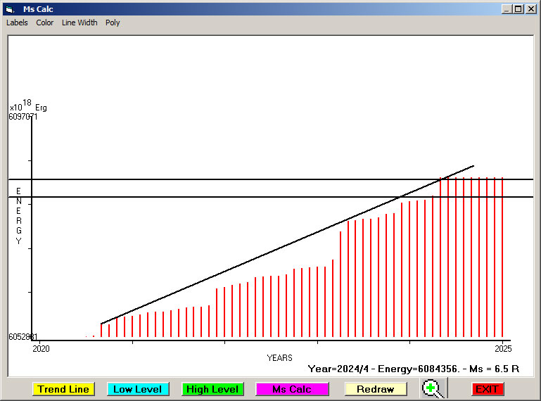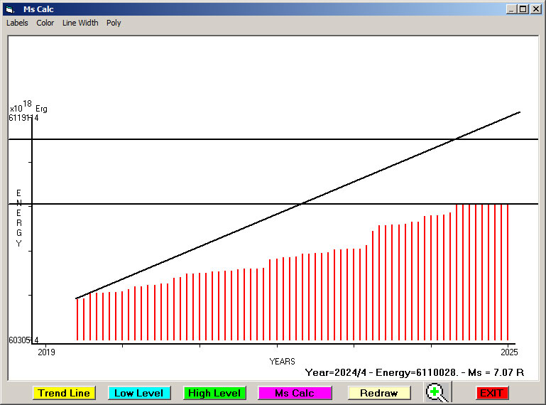 Fig. 13. Expected EQ magnitude due to application of the LSEFM (Lithospheric Seismic Energy Flow Model) on past (since 2020) seismic history of the regional seismogenic area.