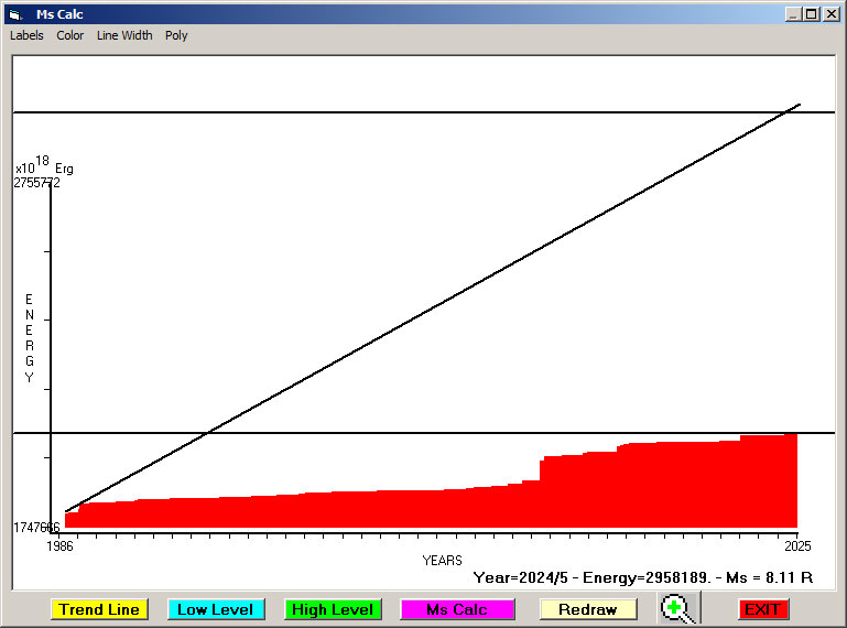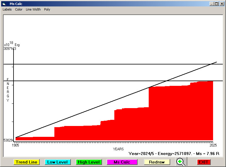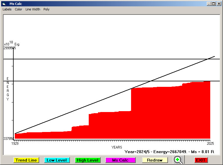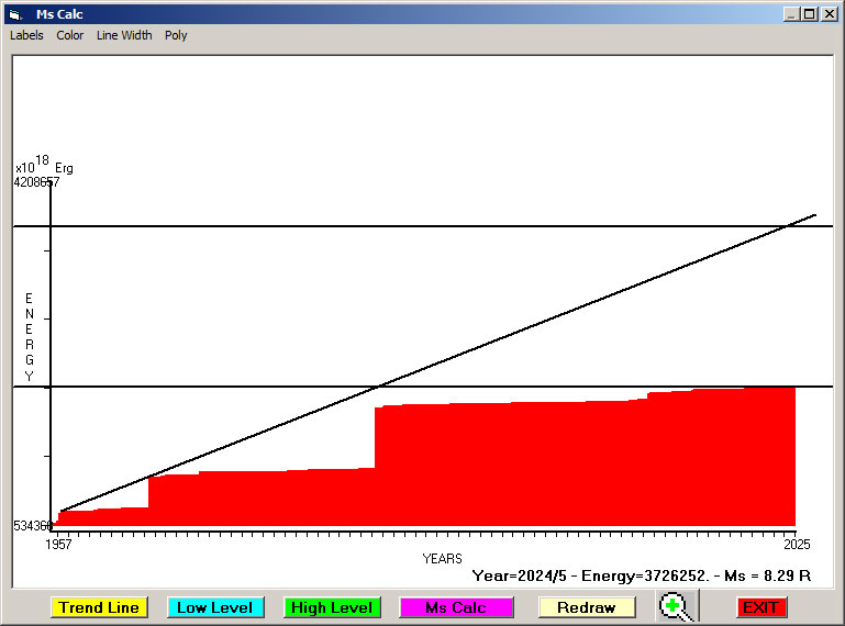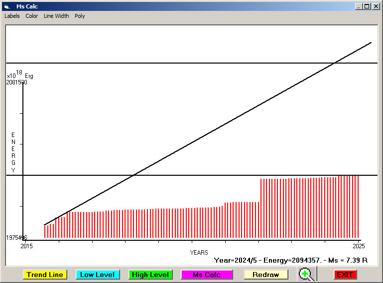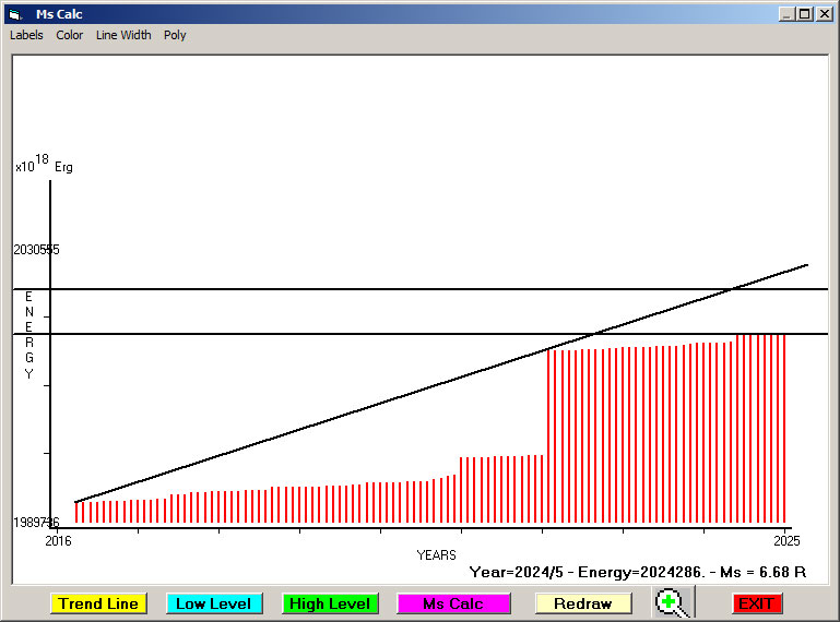 Fig. 15. Expected EQ magnitude due to application of the LSEFM (Lithospheric Seismic Energy Flow Model) on past (since 2016) seismic history of the regional seismogenic area.