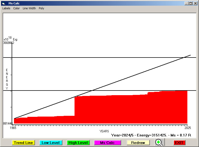 Fig. 9. Expected EQ magnitude due to application of the LSEFM (Lithospheric Seismic Energy Flow Model) on past (since 1965) seismic history of the regional seismogenic area.