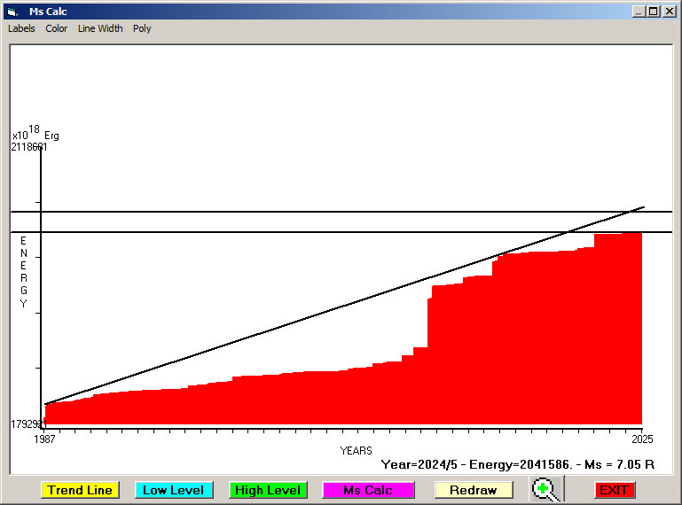 Fig. 11. Expected EQ magnitude due to application of the LSEFM (Lithospheric Seismic Energy Flow Model) on past (since 1987) seismic history of the regional seismogenic area.