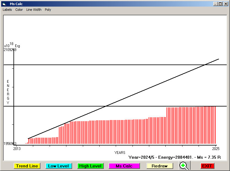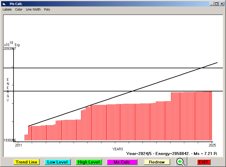 Fig. 13. Expected EQ magnitude due to application of the LSEFM (Lithospheric Seismic Energy Flow Model) on past (since 2013) seismic history of the regional seismogenic area.