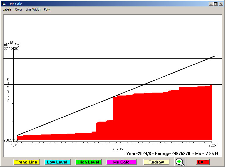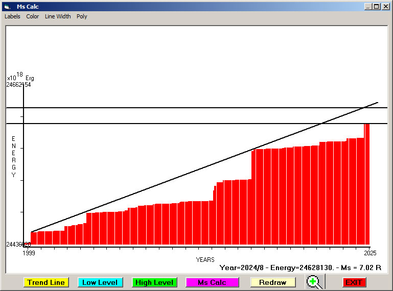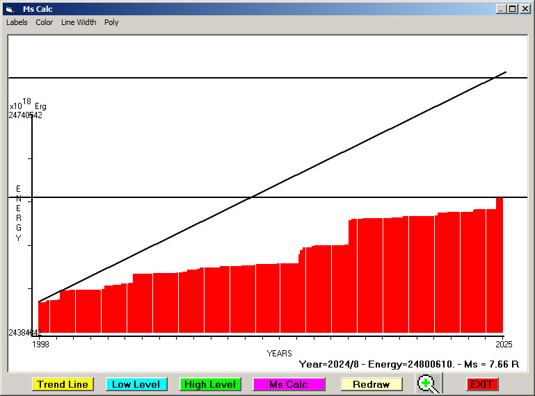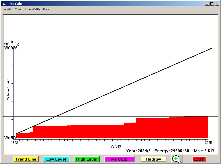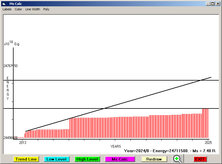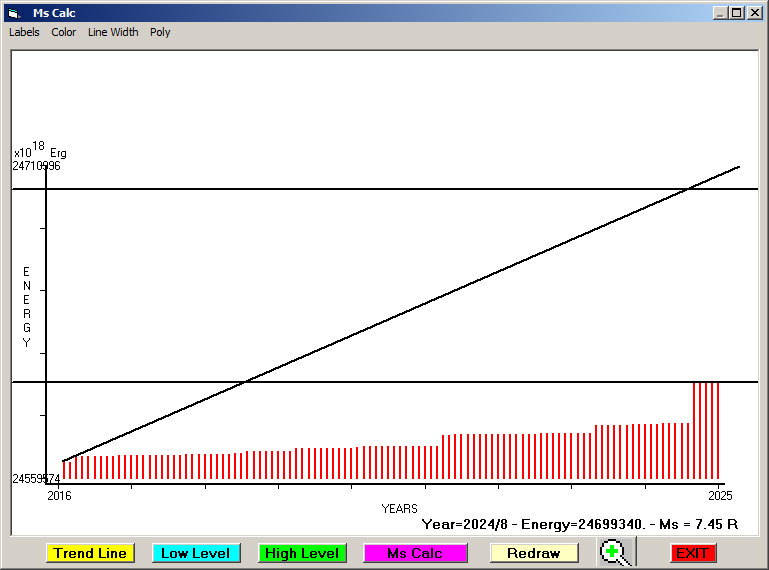 Fig. 13. Expected EQ magnitude due to application of the LSEFM (Lithospheric Seismic Energy Flow Model) on past (since 2016) seismic history of the regional seismogenic area.