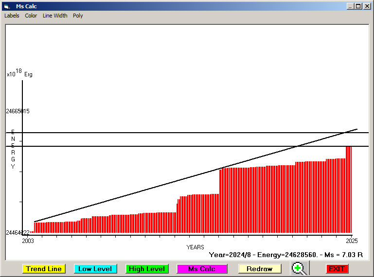 Fig. 11. Expected EQ magnitude due to application of the LSEFM (Lithospheric Seismic Energy Flow Model) on past (since 2003) seismic history of the regional seismogenic area.