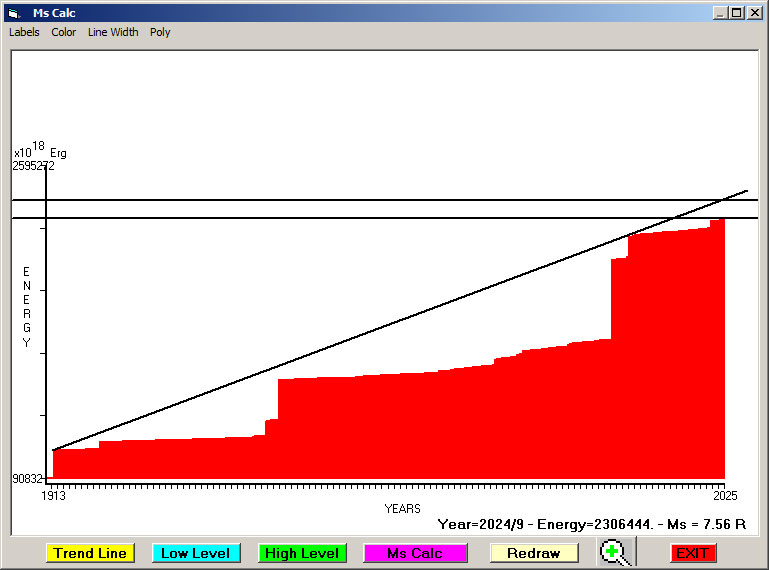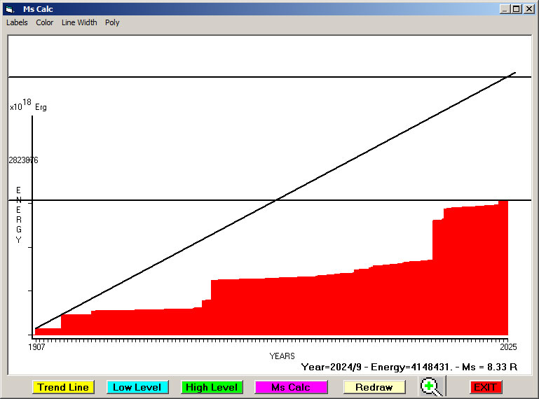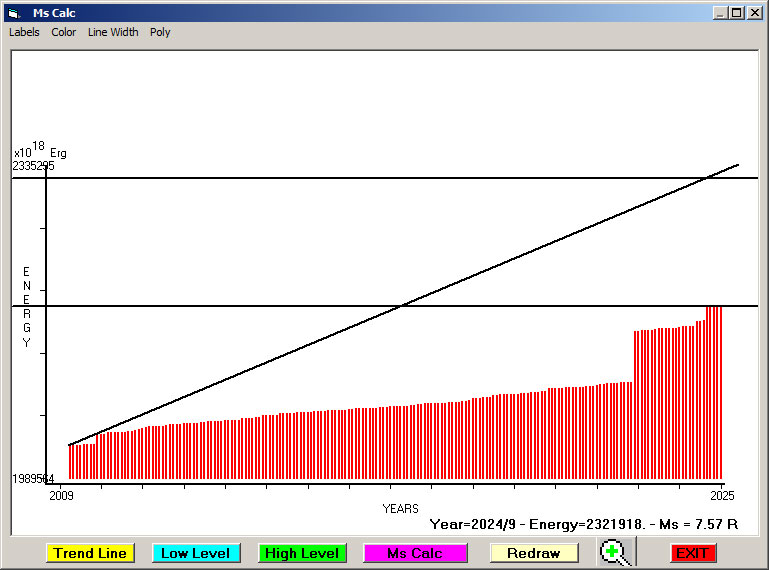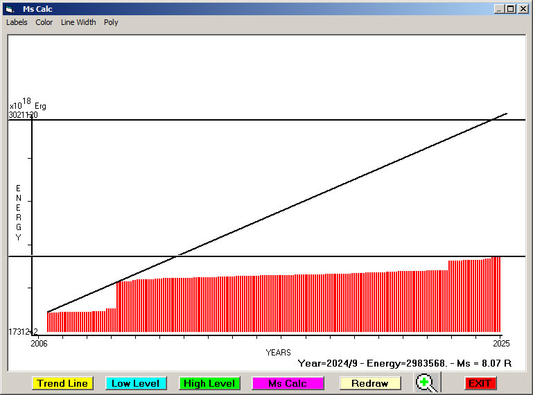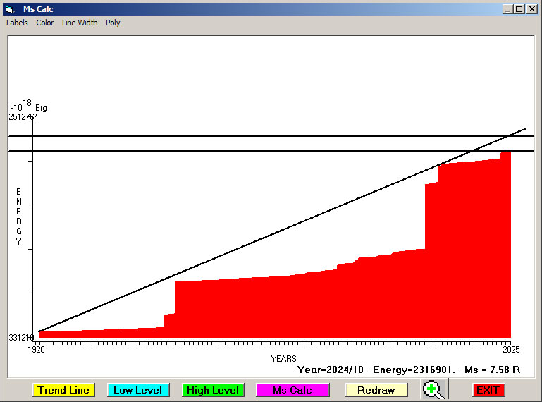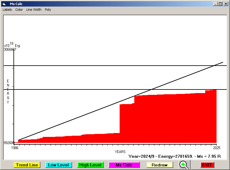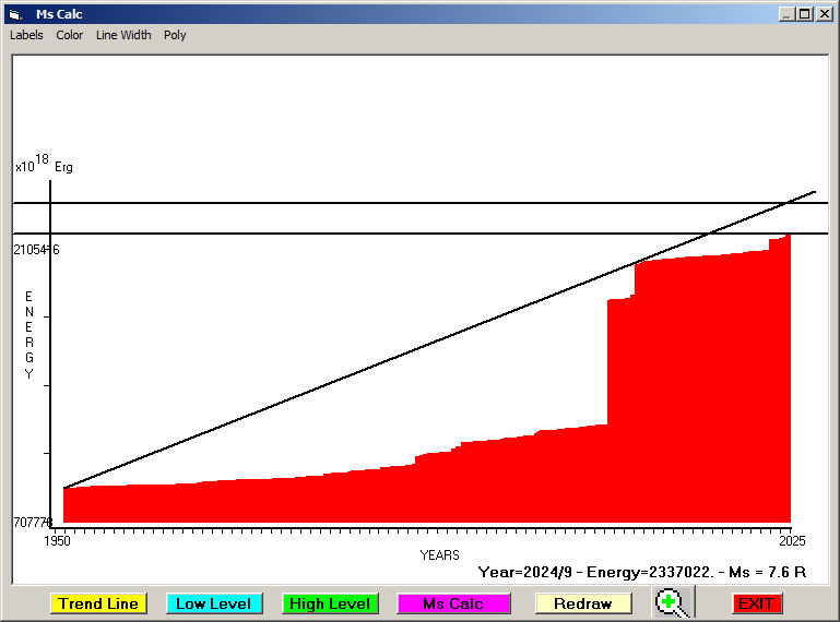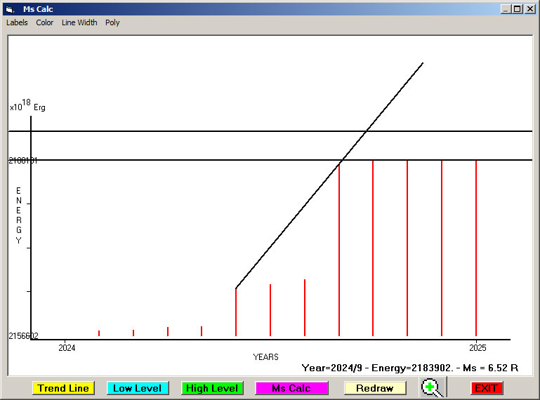 Fig. 12. Expected EQ magnitude due to application of the LSEFM (Lithospheric Seismic Energy Flow Model) on past (since 2024) seismic history of the regional seismogenic area.