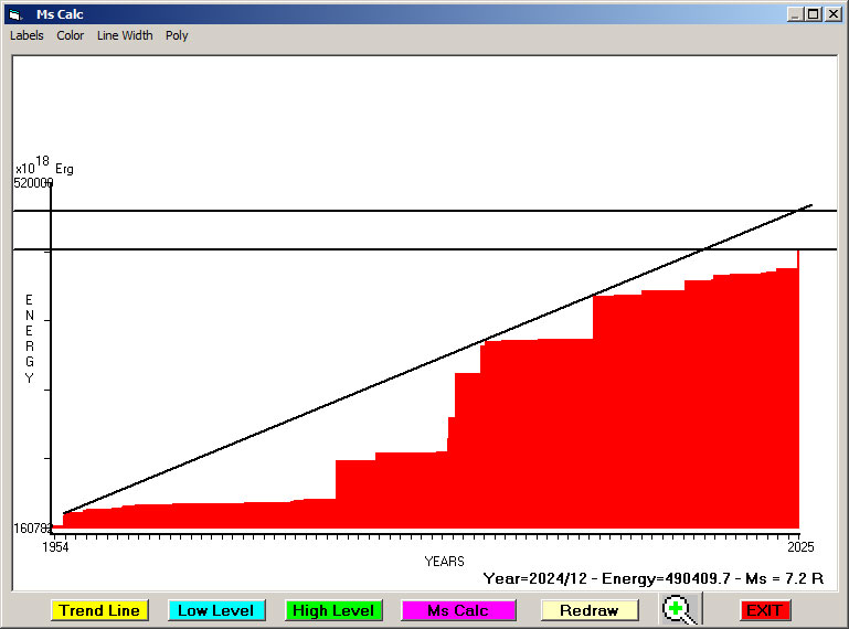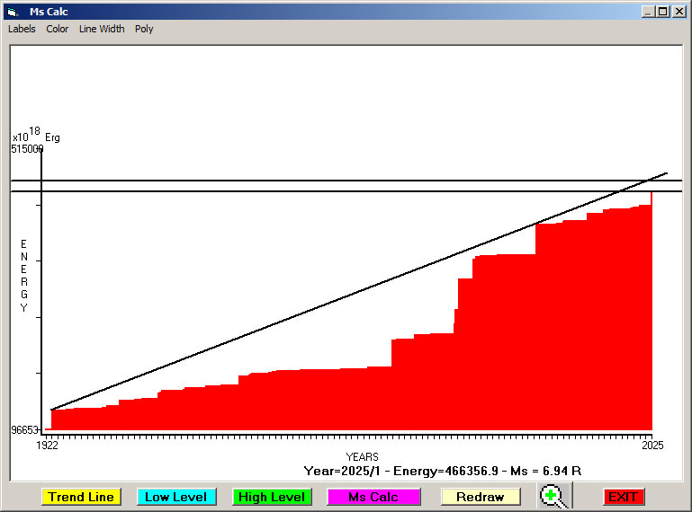 Fig. 5. Expected EQ magnitude due to application of the LSEFM (Lithospheric Seismic Energy Flow Model) on past (since 1922) seismic history of the regional seismogenic area.