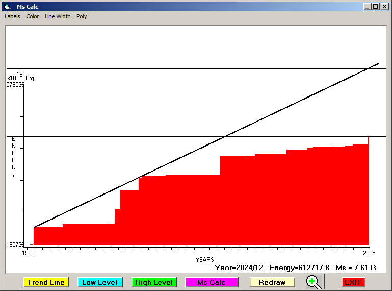 Fig. 7. Expected EQ magnitude due to application of the LSEFM (Lithospheric Seismic Energy Flow Model) on past (since 1980) seismic history of the regional seismogenic area.