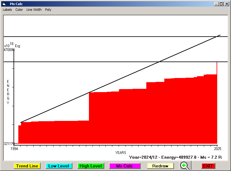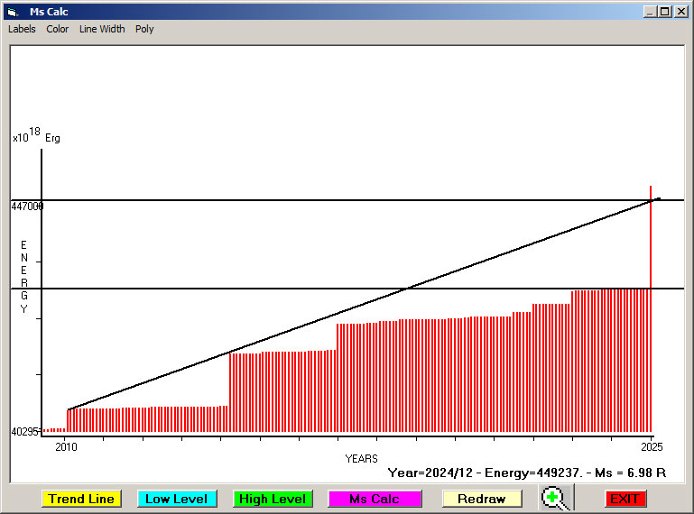 Fig. 8. Expected EQ magnitude due to application of the LSEFM (Lithospheric Seismic Energy Flow Model) on past (since 1994) seismic history of the regional seismogenic area.