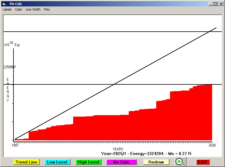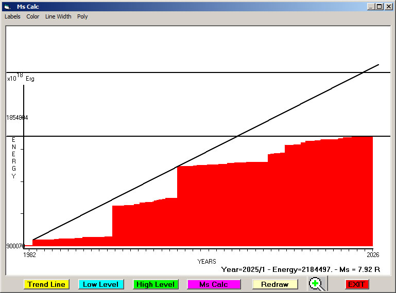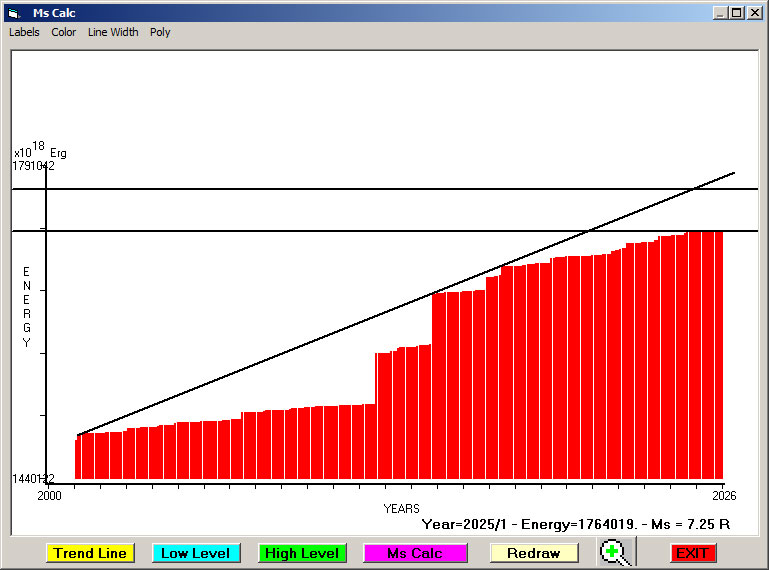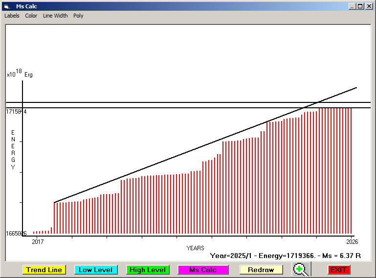 Fig. 14. Expected EQ magnitude due to application of the LSEFM (Lithospheric Seismic Energy Flow Model) on past (since 2024) seismic history of the regional seismogenic area.