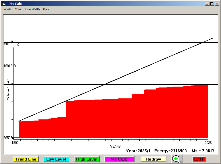 Fig. 10. Expected EQ magnitude due to application of the LSEFM (Lithospheric Seismic Energy Flow Model) on past (since 1992) seismic history of the regional seismogenic area.