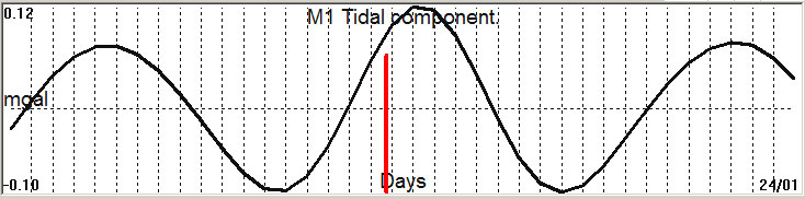 Fig. 2. M1 tidal variation (black line) v.s time of occurrence (red bar) of the EQ.