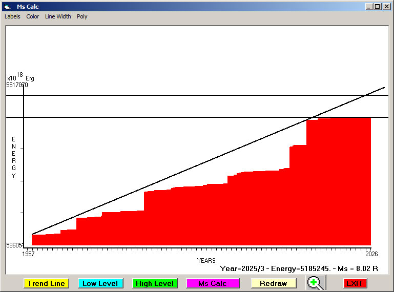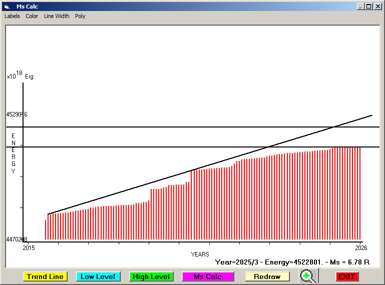 Fig. 13. Expected EQ magnitude due to application of the LSEFM (Lithospheric Seismic Energy Flow Model) on past (since 2023) seismic history of the regional seismogenic area.